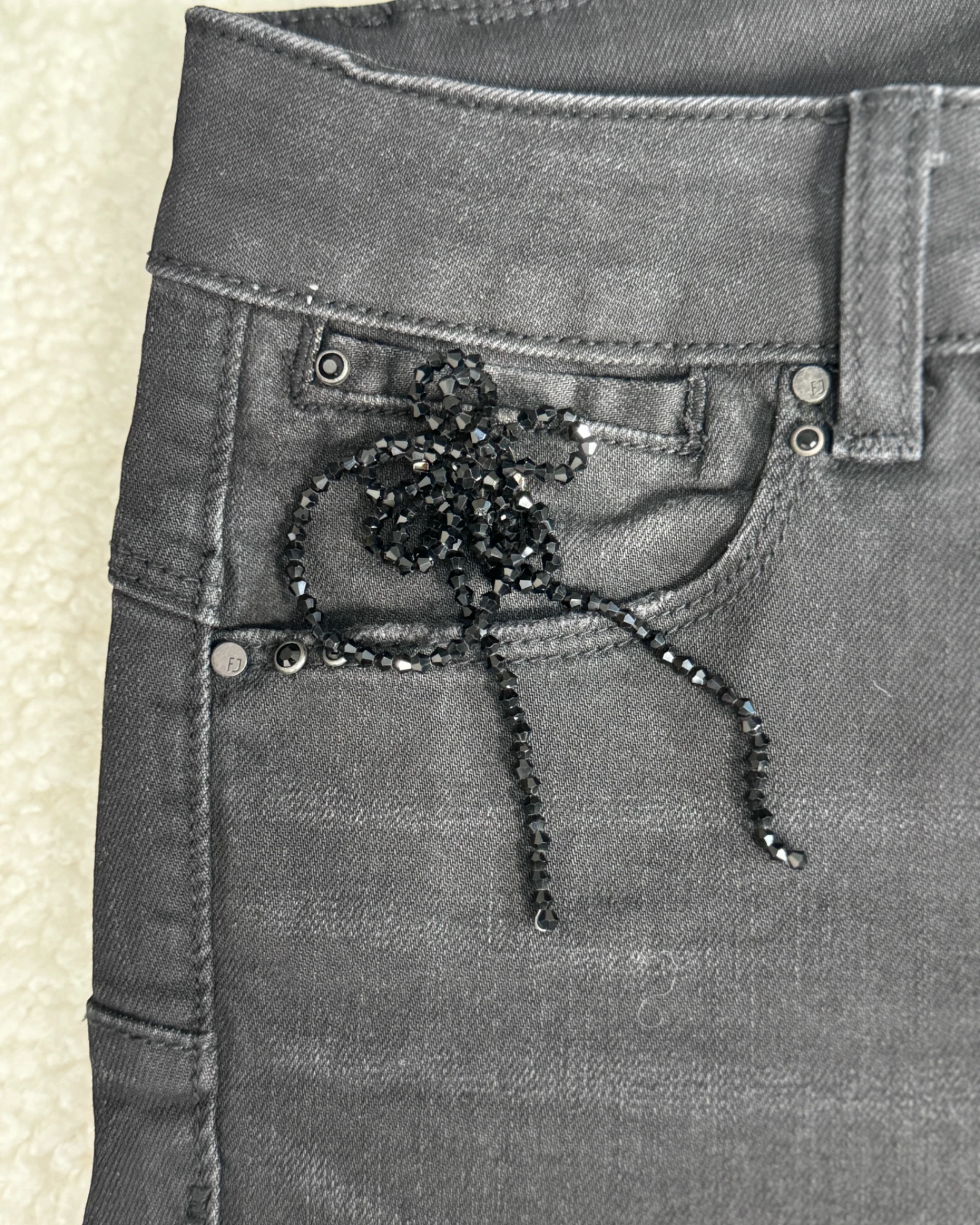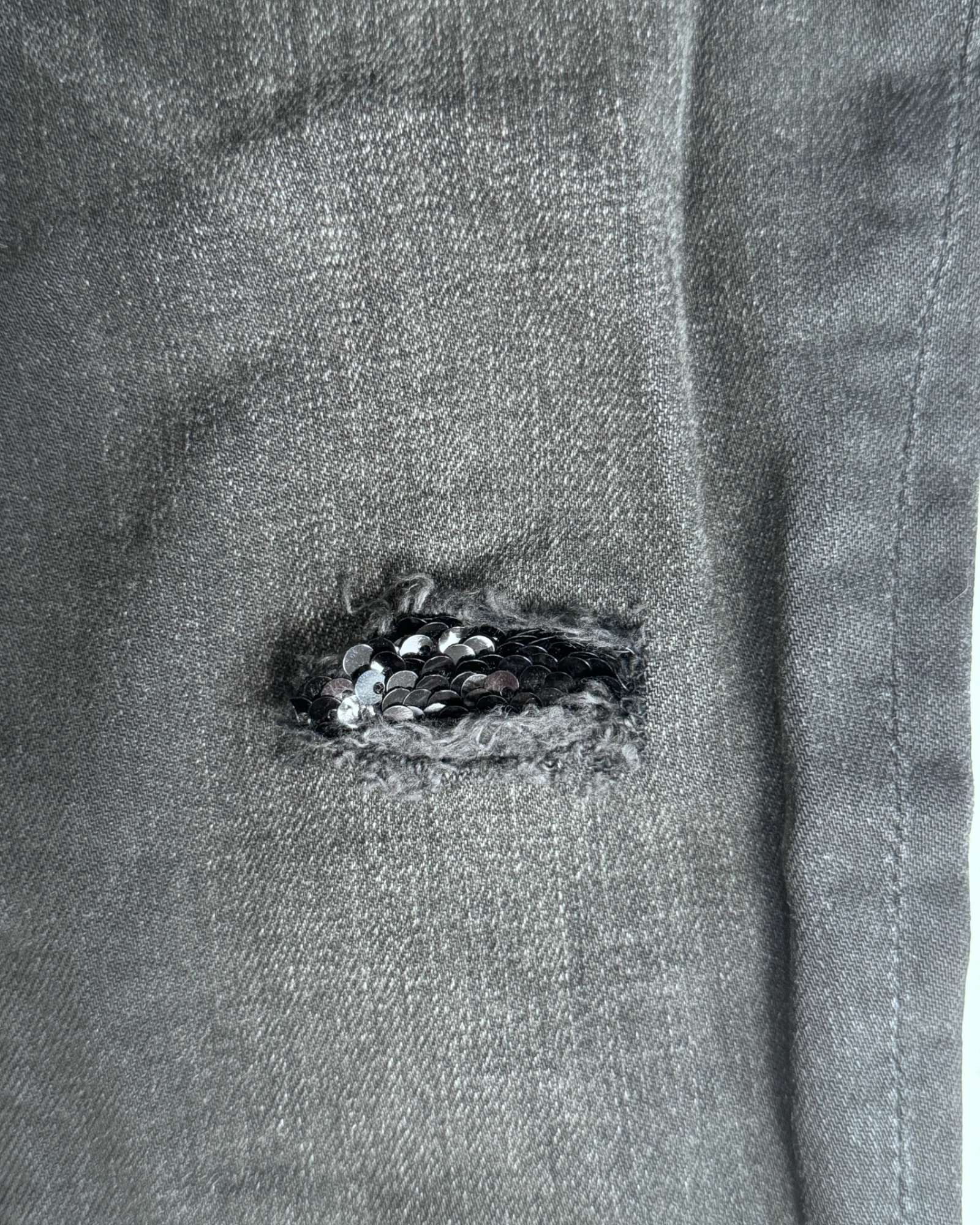 Il est orné de sequins au genoux gauche qui dissimule délicatement une déchirure.